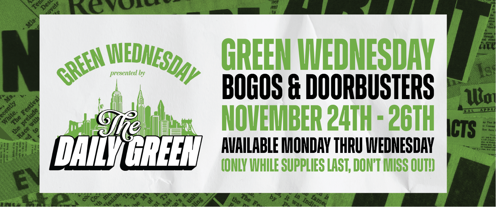 If you know about Black Friday and Cyber Monday, it’s time to add one more shopping holiday to your calendar: Green Wednesday. At The Daily Green, your Times Square cannabis dispensary and hometown paper, Green Wednesday is one of our favorite days of the year… a perfect storm of travel, tourism, and top-shelf THC.